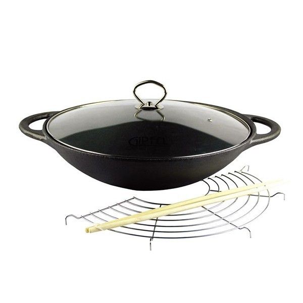 Сковорода-вок Gipfel Soong Dynasty 36 см 1312 – це вок з якісного чавуну. В комплект входить хромована решітка, скляна кришка з отвором для паровипуску, дерев'яні палички. Модель упакована у фірмову коробку Gipfel. Підходить для індукційних плит.